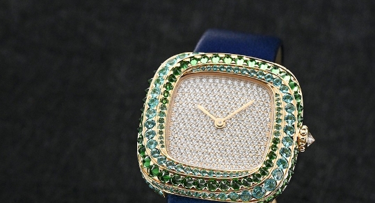 翻轉(zhuǎn)表背,可以看到在18K金袋蓋上沒有什么修飾,只鐫刻了包括限量編號及狗頭標(biāo)記等信息。帕拉伊巴碧璽也從螺旋設(shè)計延伸到了表背上。機(jī)芯方面選用石英機(jī)芯,對于這么一款珠寶款女表來說,合適,省心耐用,不用怕沒動力來回上鏈來回調(diào)節(jié)時間,要讓一位晚上要出席盛宴的女士,臨出門佩戴表款前還得調(diào)時間,多少感覺也是有點(diǎn)麻煩。