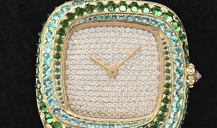 表殼整體鑲嵌120顆帕拉伊巴碧璽搭配56顆沙弗萊石,這兩種寶石也都被譽(yù)為珠寶界新貴,沙弗萊是一種綠色的鈣鋁榴石,很多人評價它就是顏色飽和度高、亮度高、凈度高,經(jīng)常跟祖母綠做對比。而帕拉伊巴碧璽這種綠藍(lán)色調(diào)的電氣石,也常跟海藍(lán)寶石比較,同樣的清澈,又稍微帶點(diǎn)偏綠,不光色調(diào)漂亮,也因?yàn)楫a(chǎn)量低導(dǎo)致價格很高??ǖ貋啚榱诵卤恚善放乒ぷ鞣婚_創(chuàng)了三角形鑲嵌工藝,跟傳統(tǒng)的珠粒爪鑲相比,鉆石寶石直接嵌于表殼,每個寶石、鉆石的8個點(diǎn)位固定更多了,減少了金屬遮擋的部分,更璀璨美觀,每個鑲嵌槽位也因?yàn)閷毷笮〔灰?,都是手工制作?/p>